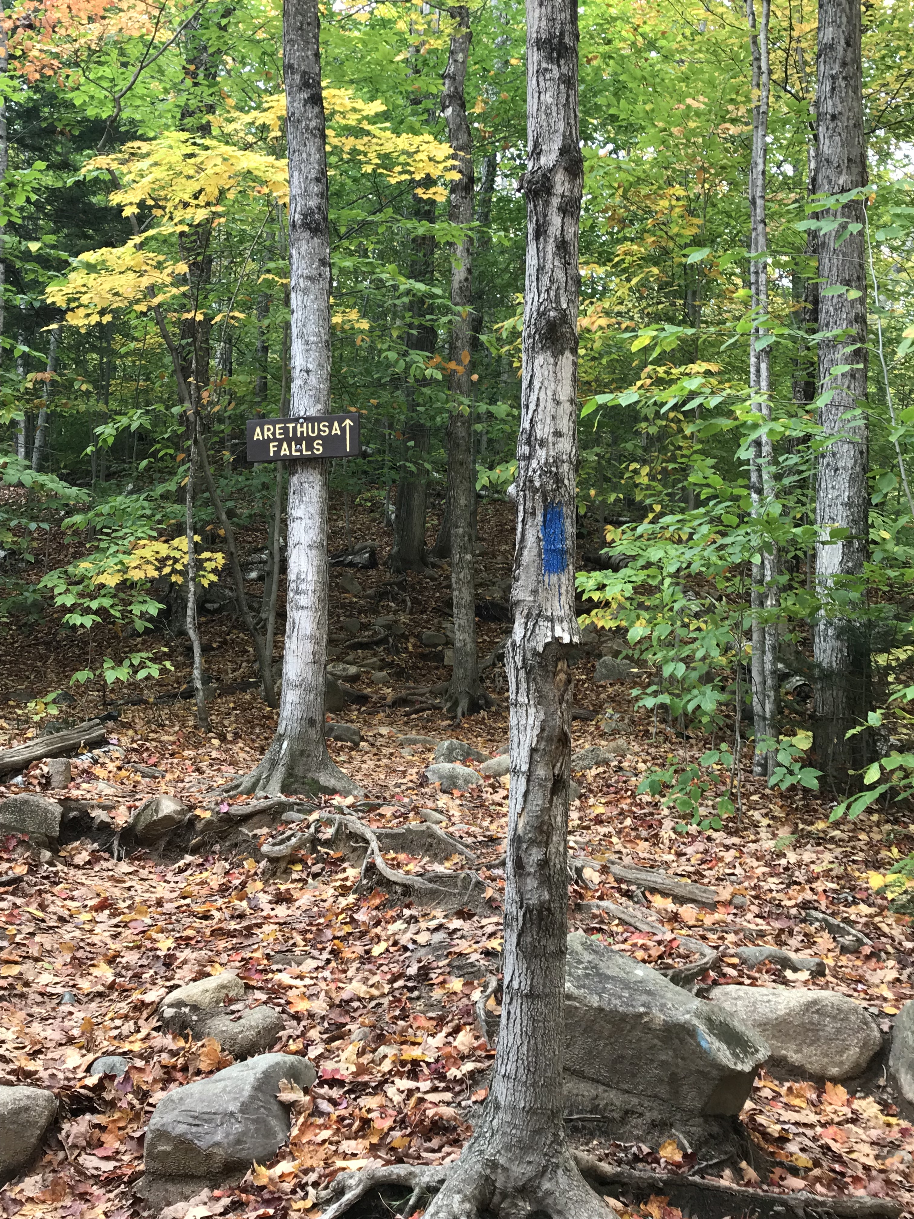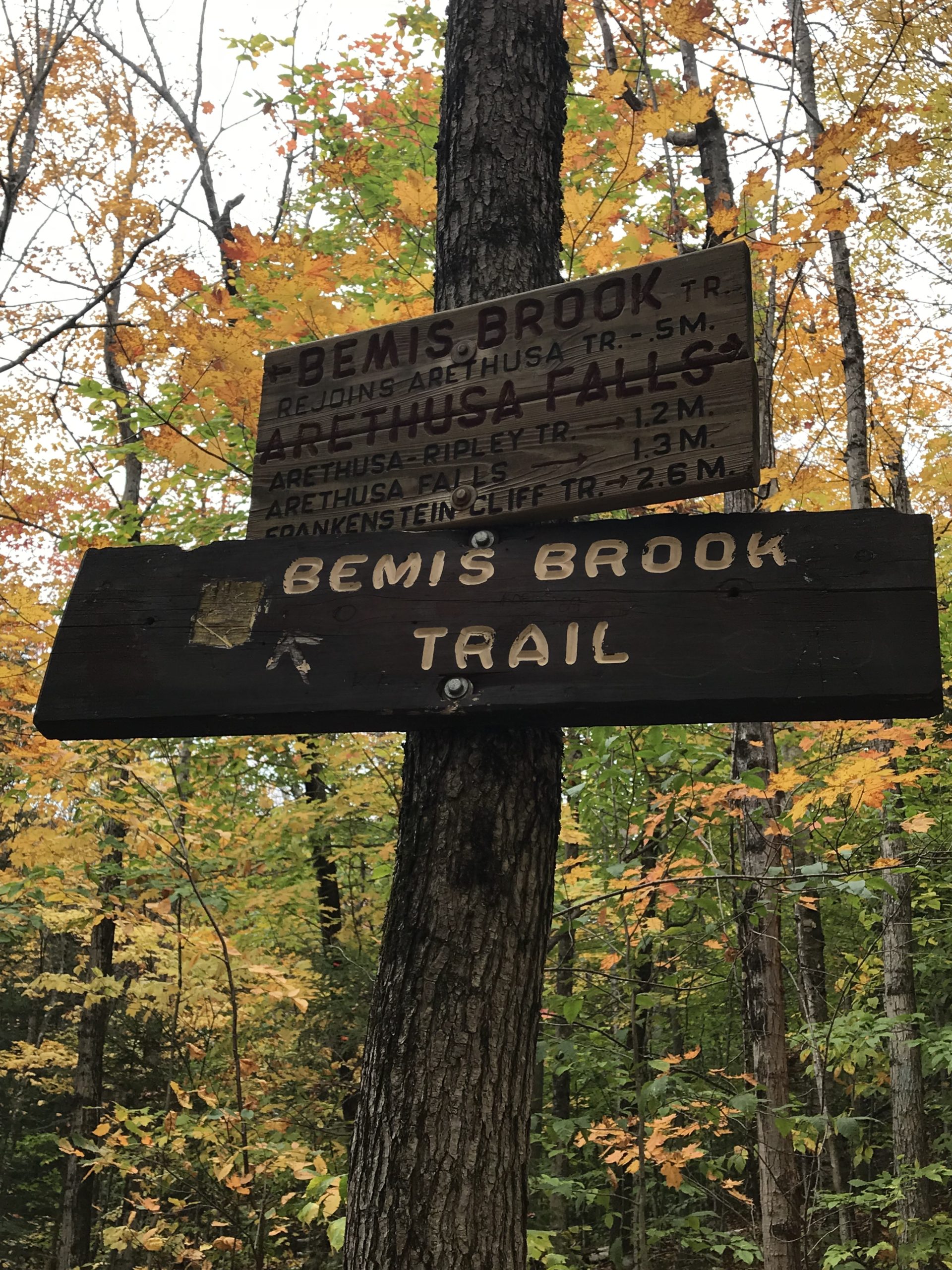 The trailhead is very easy to find as there is a large wooden sign that says “Arethusa Falls.” This sign will be easily visible while driving along route 302, otherwise known as Crawford Notch Road. This is the sign for those whom would like to know what it looks like.