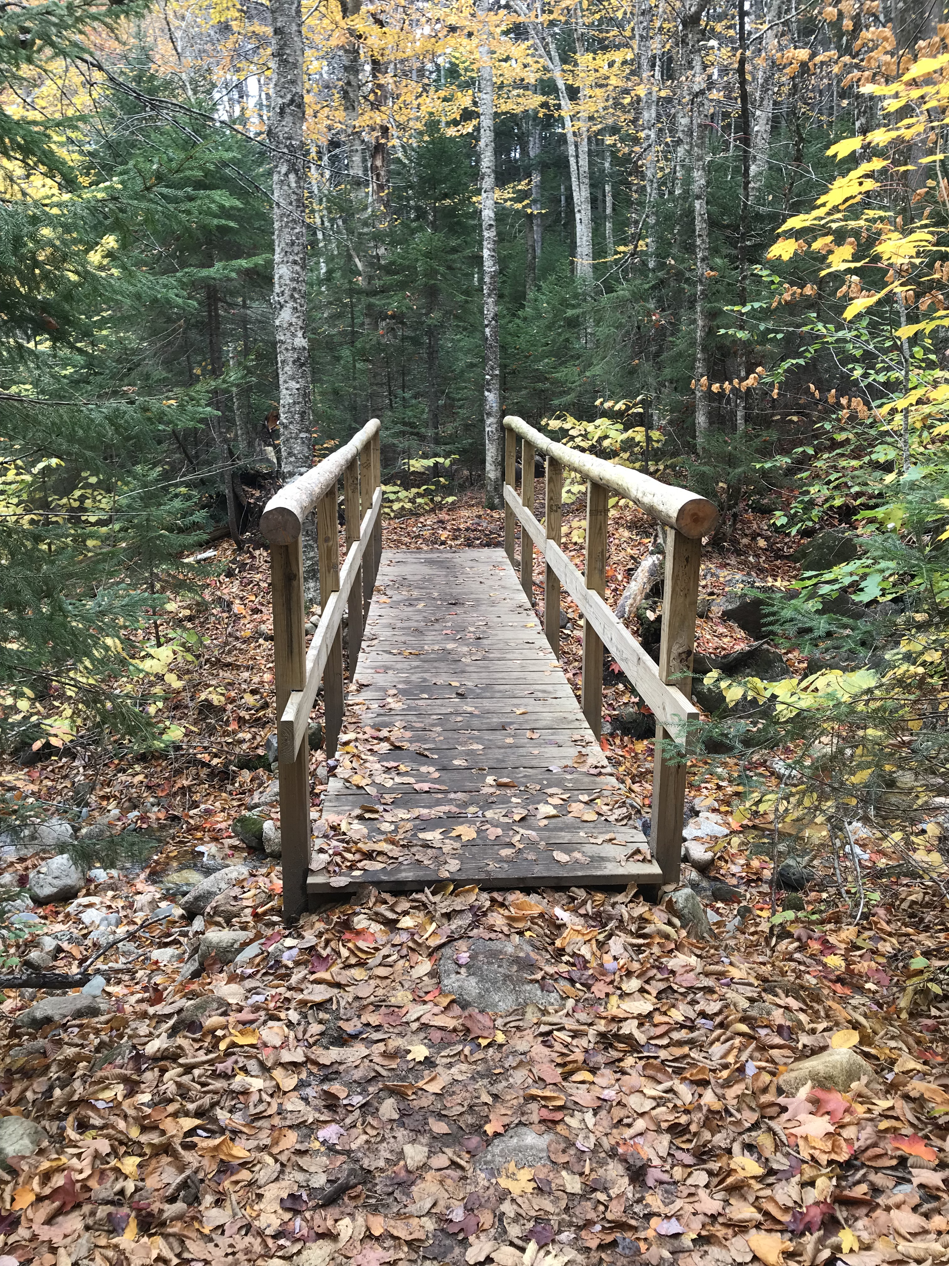 The lot here is pretty large, but I would still get here earlier in the day as it seemed like a popular hike in the area. This makes sense as it is only a one hour hike to the tallest waterfall in New Hampshire. In the parking lot, there are cliffs that tower above. We had the luck of seeing the trees under the cliffs in various shades of color. It made for a picturesque view.