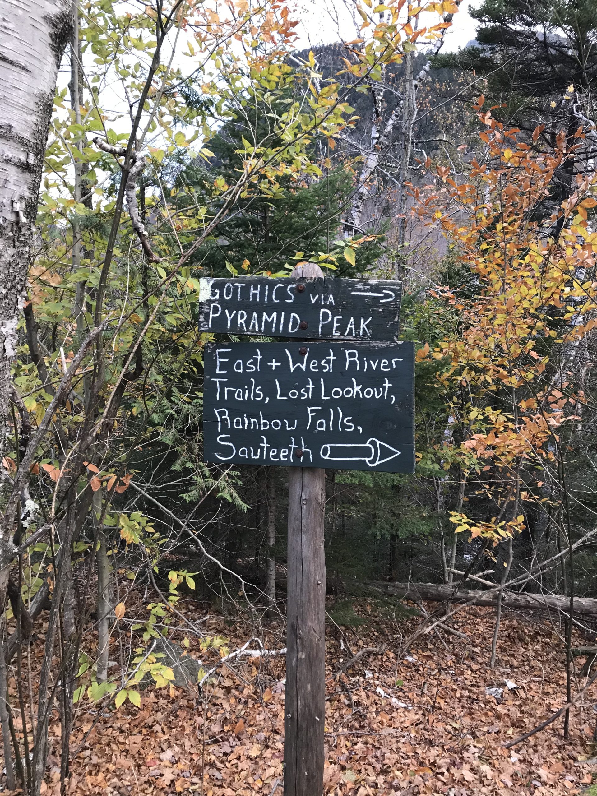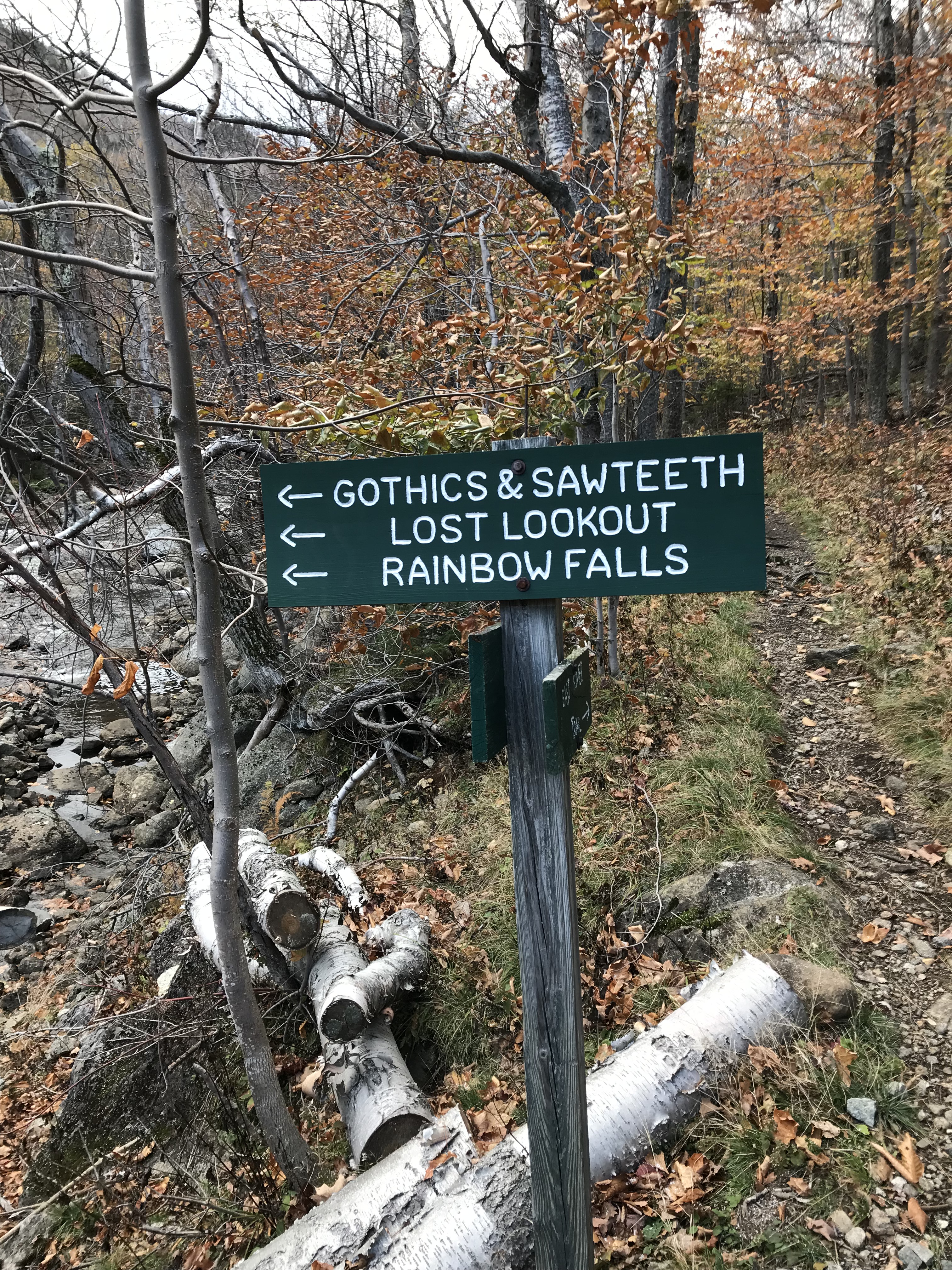 Keep making your way along the trail and you will eventually hit a green sign right in front of you that says “Marble <- Point.” To continue to Sawteeth Mountain, you are going to want to take a right.
