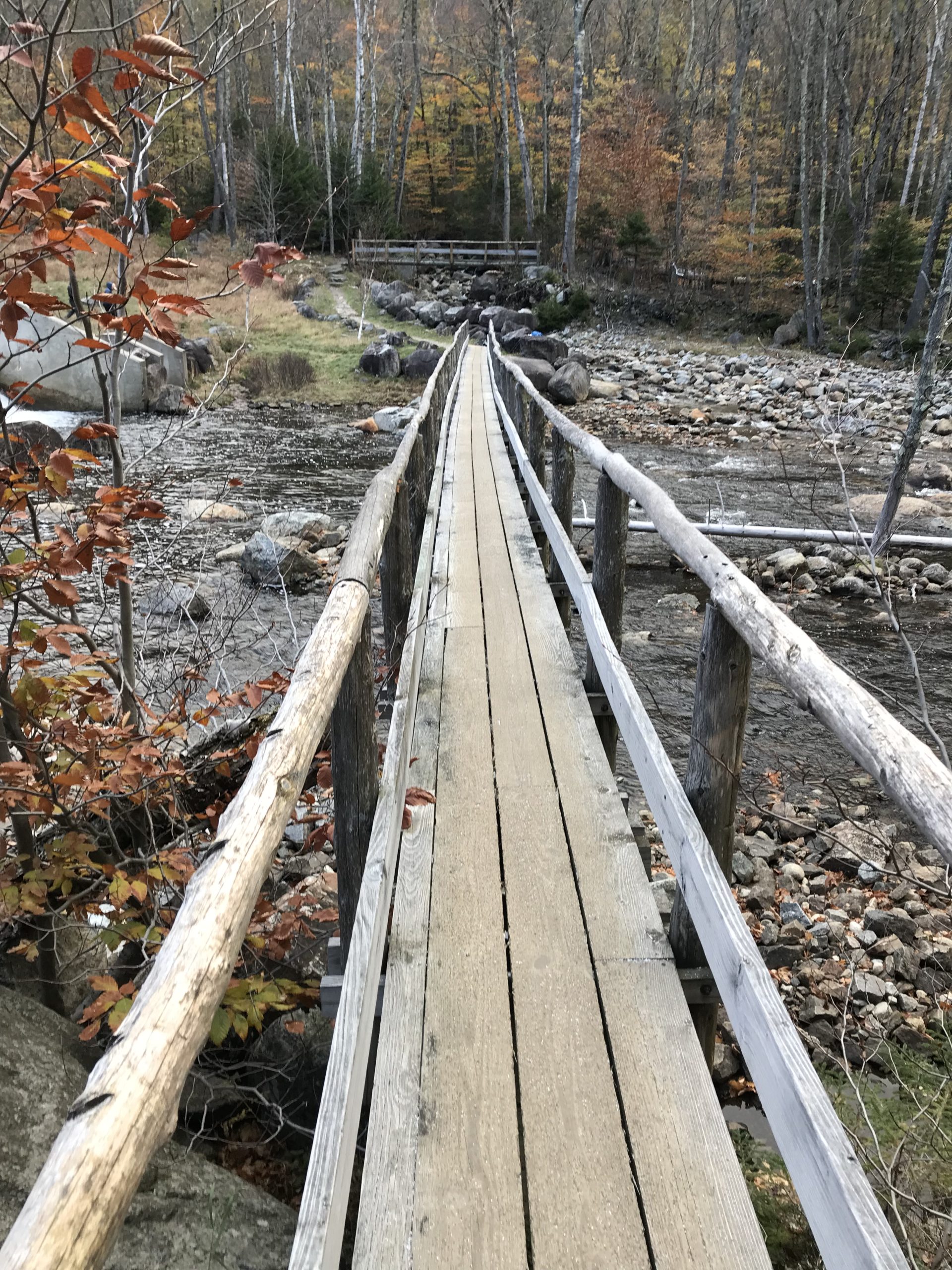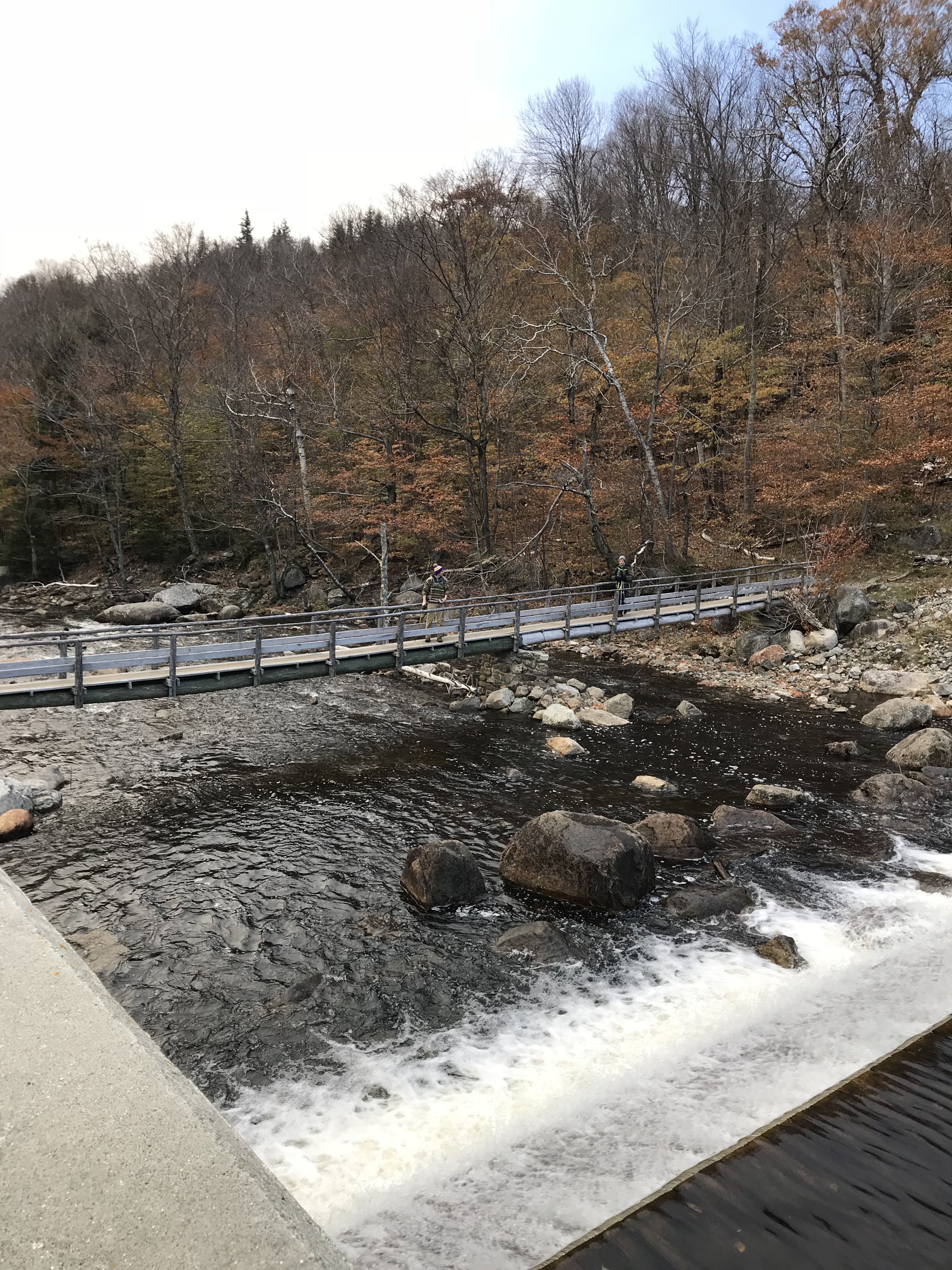 Once across this bridge, walk up to the concrete wall just before Lower Ausable Lake to take in the views. When we hit this area, some snowflakes started to fall. It was not supposed to snow, but we brought snow gear anyway. Remembering to be prepared for anything is important. Below is the view once crossing the bridge.